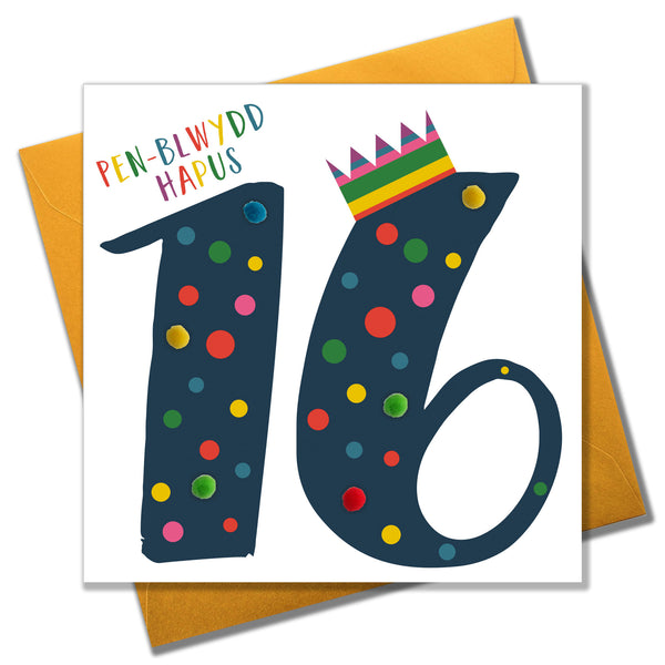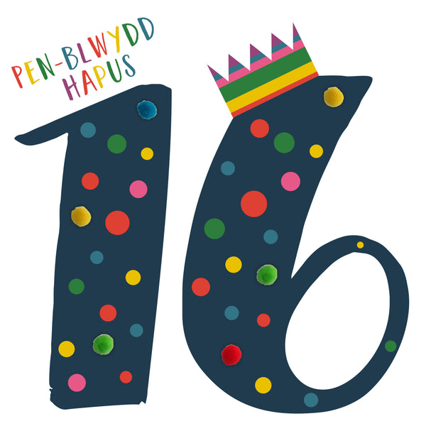 Welsh Age 16 Blue Birthday Card, Penblwydd Hapus, Embellished with Pompoms