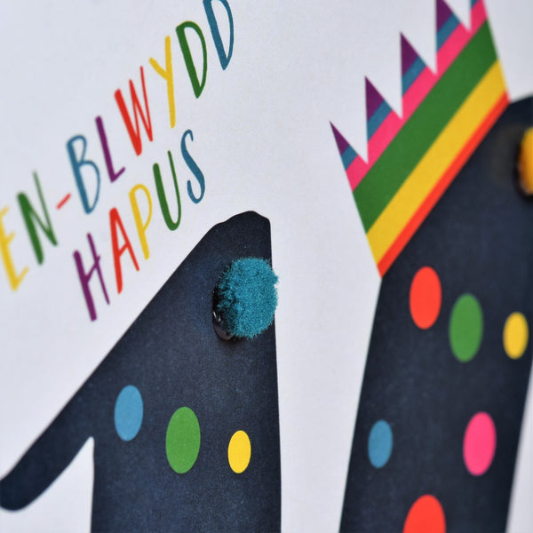 WPOM116BA wonderful contemporary Welsh language greeting card. A mix of bright bolds colours, and hand finished with wonderful colourful pompom embellishments. Printed on high quality board from sustainable sources with bright envelope, and each comes in a biodegradable bag.