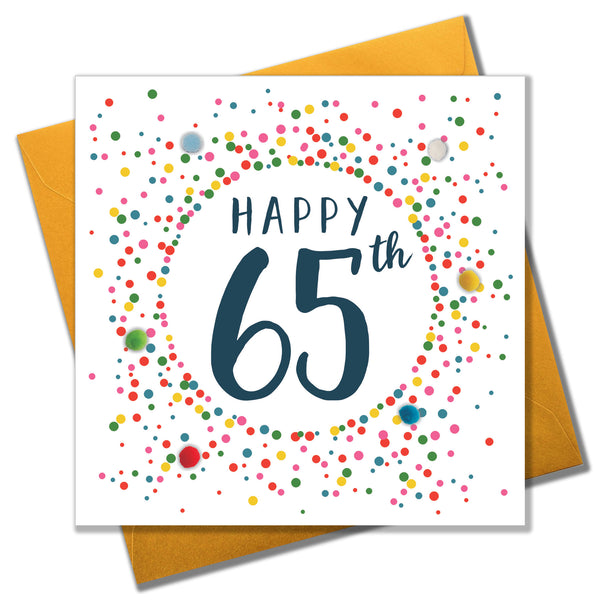 POM047A beautiful modern greeting card for that very special 65th birthday. The card has lovely colourful polka dot design, and is embellished with bright pompoms and printed on high quality white FSC accredited board with a bright gold envelope.