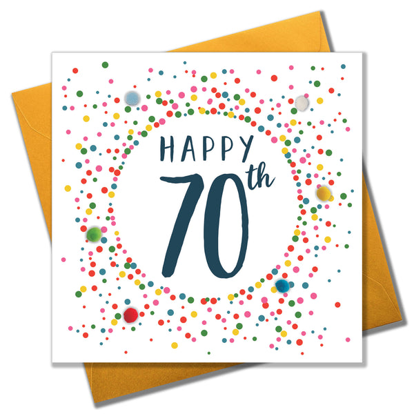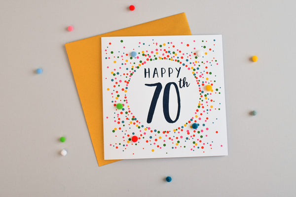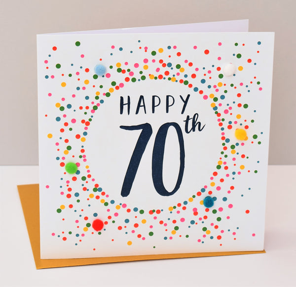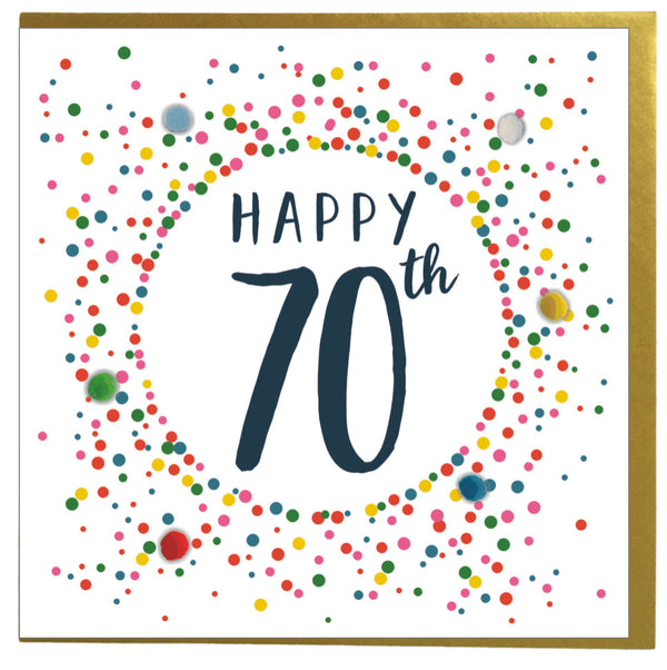 POM048A beautiful modern greeting card for that very special 70th birthday. The card has lovely colourful polka dot design, and is embellished with bright pompoms and printed on high quality white FSC accredited board with a bright gold envelope.