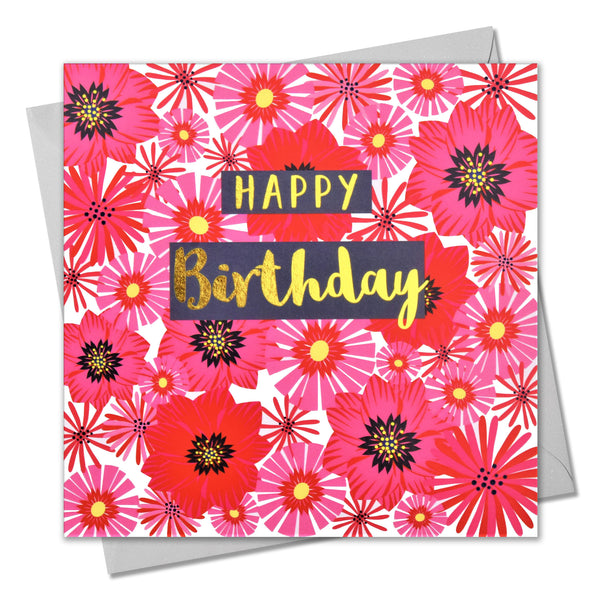 Birthday Card, Flowers, Happy Birthday, text foiled in shiny gold