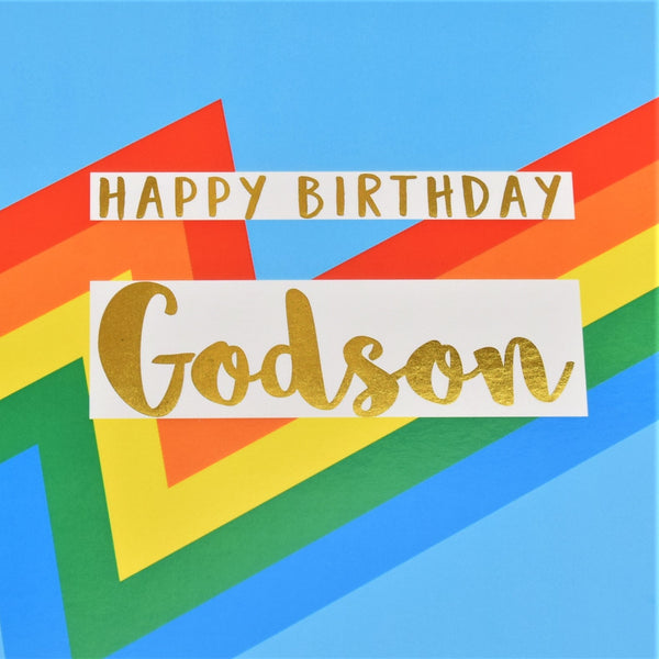 COL050This beautiful vibrant foiled Godson Birthday card is from the amazing Colour Pop range. Designed with colourful shapes and bright images, and the writing is foiled in shiny gold. Printed on high quality board from sustainable sources with a grey envelope, and each comes in a biodegradable bag.