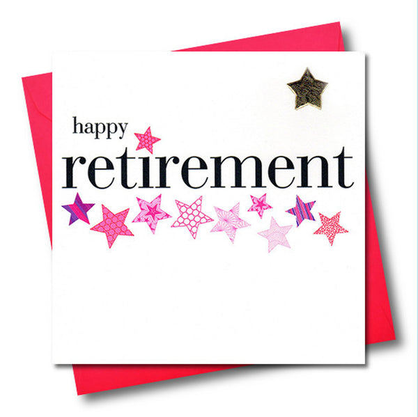 HNS87PPrinted on white card with a subtle shimmer, this range has large graphics and beautiful embellishments. 'Happy Retirement' is printed with a line of patterned pink stars and the card is embellished with a shiny padded gold star.
