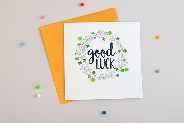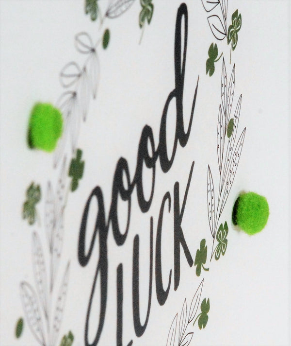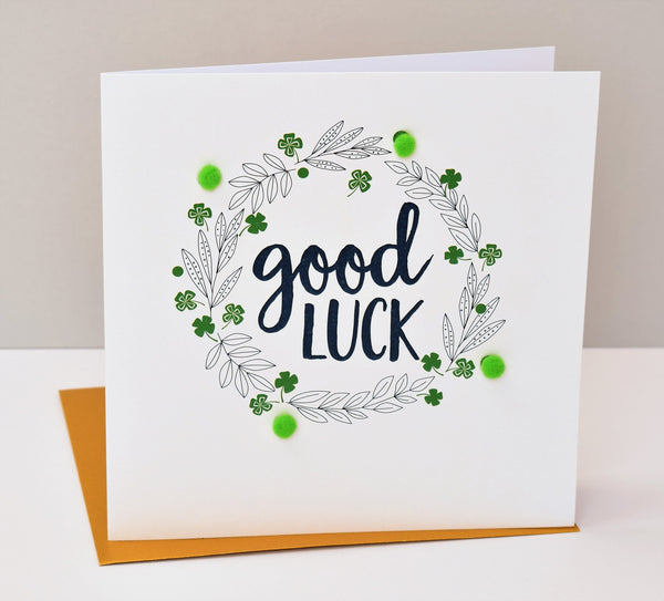 POM055A wonderful modern greeting card to wish that special person Good Luck. This card has a delightful laurel and four leaf clover design, and is embellished with bright green pompoms and printed on high quality white FSC accredited board with a bright gold envelope.