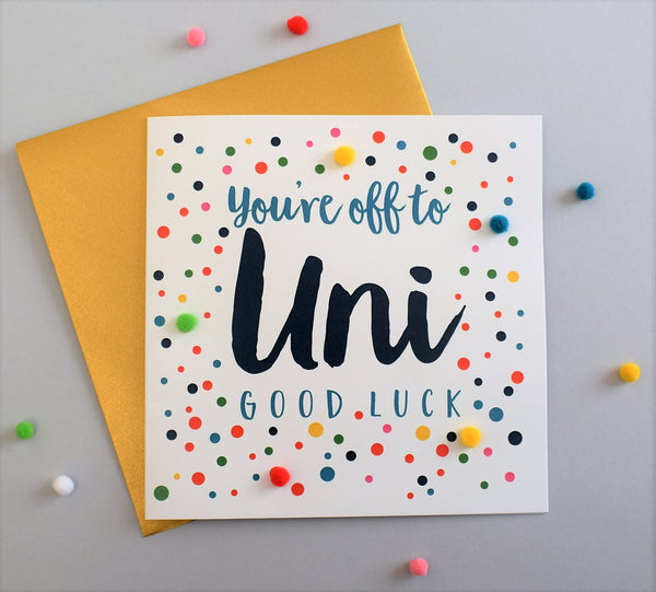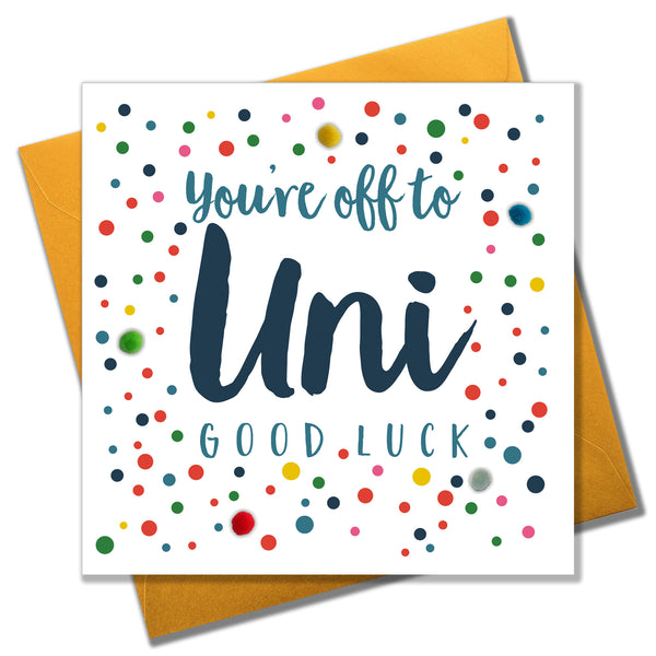 Good Luck Card, Dotty, You're off to Uni, University, Embellished with pompoms