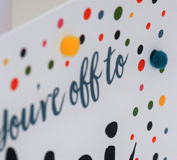 POM078A wonderful modern greeting card to wish someone good luck at University. The card has lovely colourful polka dot design, and is embellished with colourful pompoms and printed on high quality white FSC accredited board with a bright gold envelope.