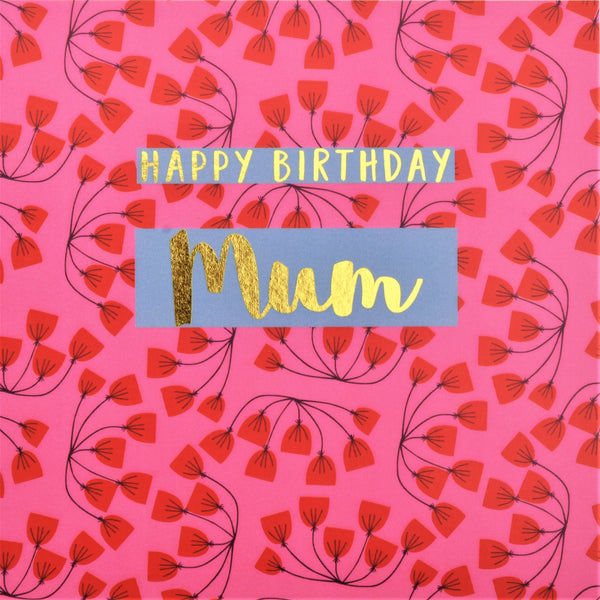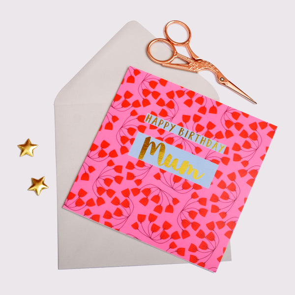 Birthday Card, Mum Pink Flowers, Happy Birthday Mum, text foiled in shiny gold