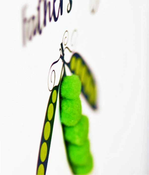 FPO010A wonderful funny Father's Day card, wishing your dad a very 'Hap-Pea Father's Day' with a colourful pea pod design. Embellished with bright coloured pompoms and printed on high quality white board with a shiny silver envelope.