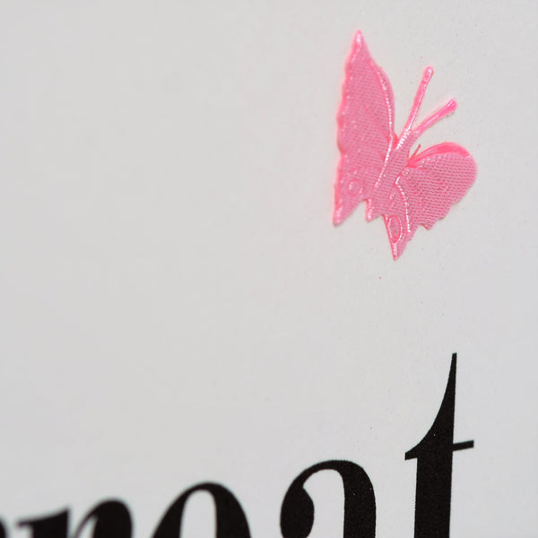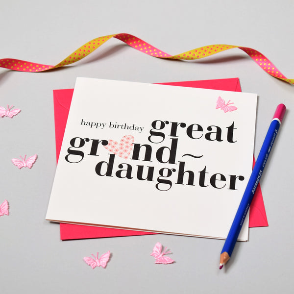 HNS148Printed on white card with a subtle shimmer, this range has large graphics and beautiful embellishments. 'happy birthday great grand-daughter' is printed with a patterned red star and the card is embellished with a pink fabric butterfly.