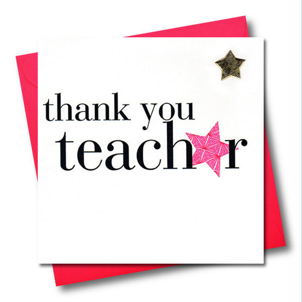 HNS91Printed on white card with a subtle shimmer, this range has large graphics and beautiful embellishments. 'Thank you Teacher' is printed with a single patterned pink star and the card is embellished with a shiny padded gold star.