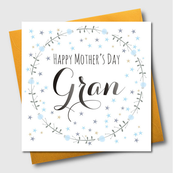 MQU014This beautiful card has stars and lovely foliage, with 'Happy Mother's Day Gran' printed in a hand-written style. It comes with a matching golden envelope.