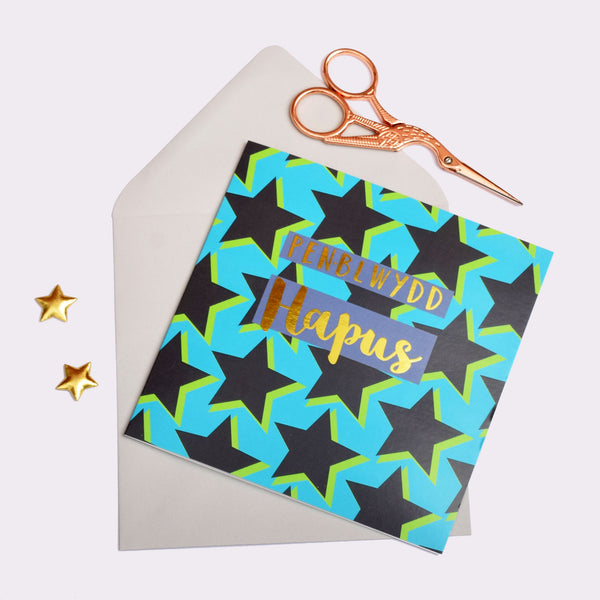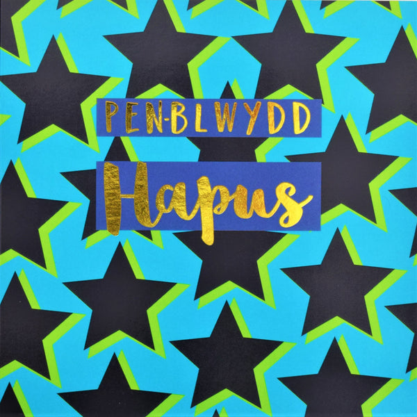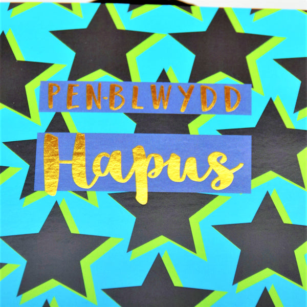 Welsh Birthday Card, Penblwydd Hapus, Stars, text foiled in shiny gold