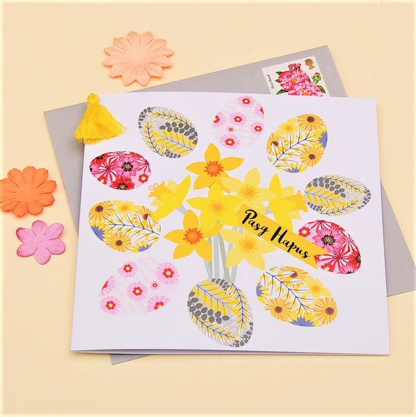Welsh Easter Card, Pasg Hapus, Daffodils, Embellished with a colourful tassel