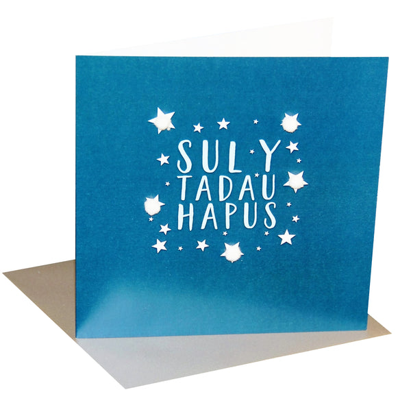 WFPO011A brilliant masculine Welsh language Father's Day card, for that star of a dad. Embellished with white pompoms and printed on high quality white board with a shiny silver envelope.