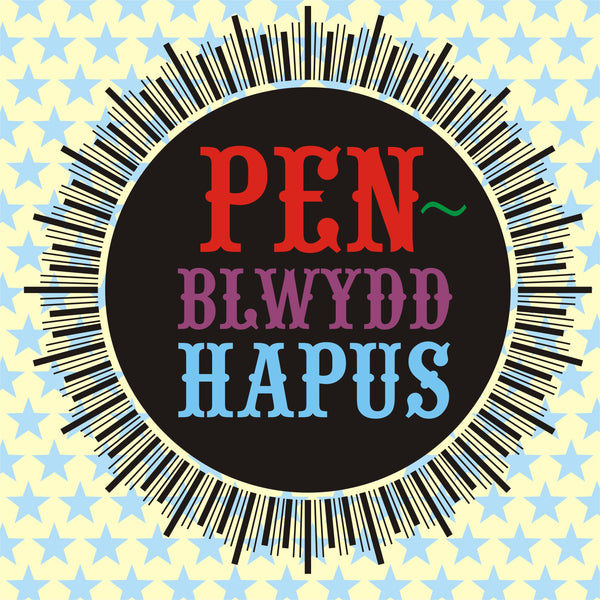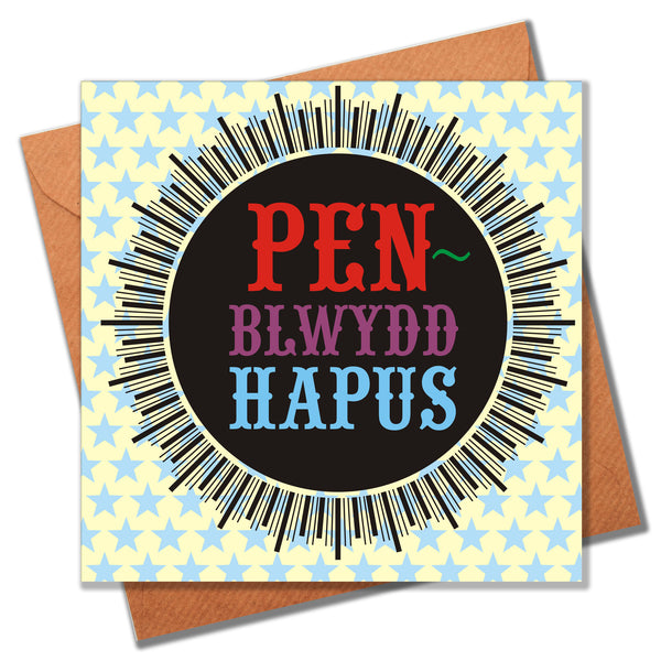 WHAT107Set against a starry background of pale blue and yellow, a large birthday medal is printed is bright primary colours. 'Penblwydd Hapus' is printed large . The envelope contrasts nicely and is made of brown parcel paper.
