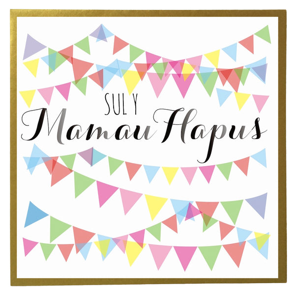 WMQU006This card is a sea of pretty pastel coloured bunting. 'Sul y Mamau Hapus' is printed in a hand-written style text. This card comes with a shiny golden envelope.