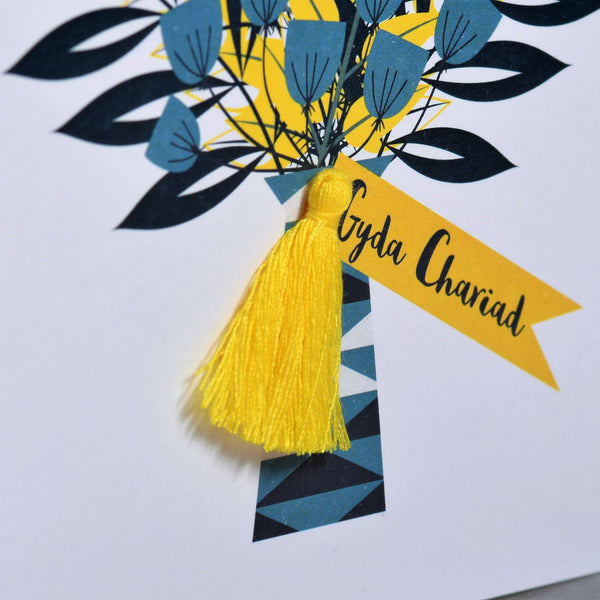 WMTA004A wonderful contemporary Welsh Language Mother's Day card for your wonderful Mum. Fun designs with bold bright colours and each card is hand finished with a tassel embellishment. Printed on high quality board from sustainable sources with slate grey envelope, and each comes in a biodegradable bag.