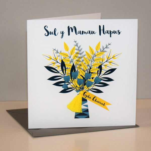 Welsh Mother's Day Card, Sul y Mamau Hapus, Flowers Bouquet, Tassel Embellished