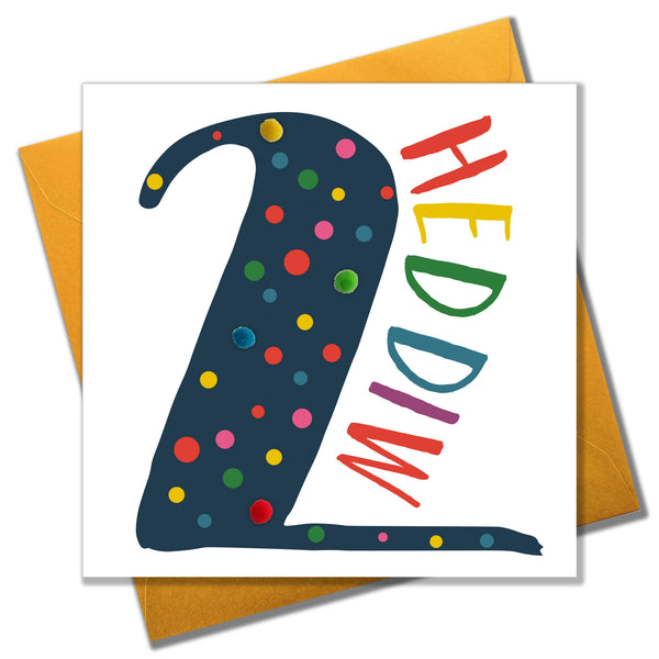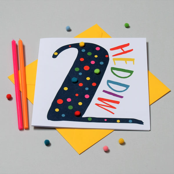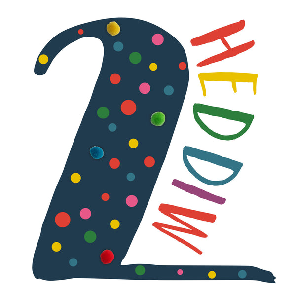 WPOM102BA wonderful contemporary Welsh language greeting card. A mix of bright bolds colours, and hand finished with wonderful colourful pompom embellishments. Printed on high quality board from sustainable sources with bright envelope, and each comes in a biodegradable bag.