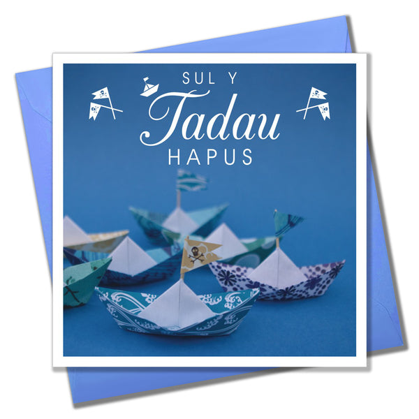 WPOP001This cheerful Father's card has beautiful origami boats sailing on a paper sea. 'Sul Y Tadau Hapus' - Happy Father's Day is contrasted in white. This sea fresh card comes with a bright blue envelope.