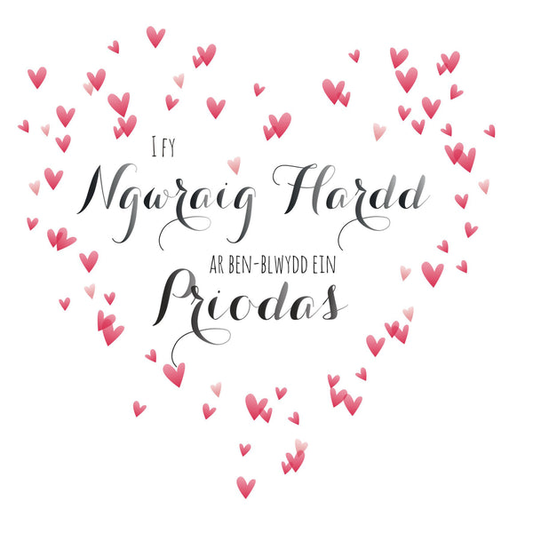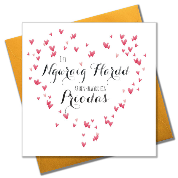 WQUI028This beautiful anniversary card has tiny red hearts in the shape of a heart, and 'I fy Ngwraig Flardd ar ben-blwydd ein priodas' looks hand written. It comes with a matching gold envelope