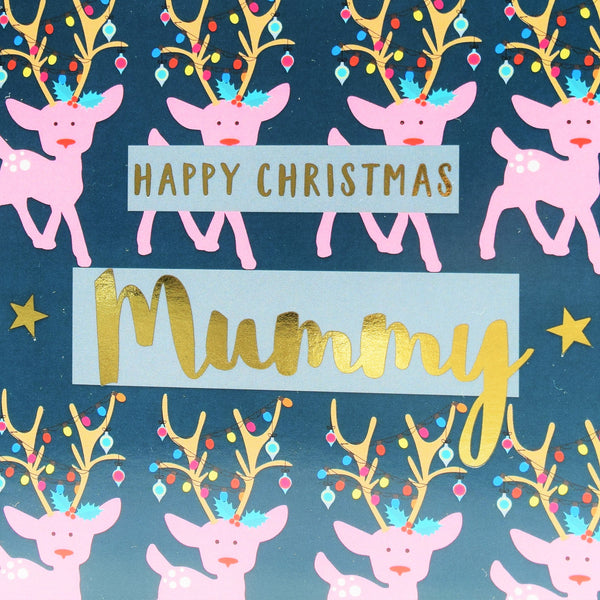 Christmas Card, Mummy Reindeers and Lights, text foiled in shiny gold