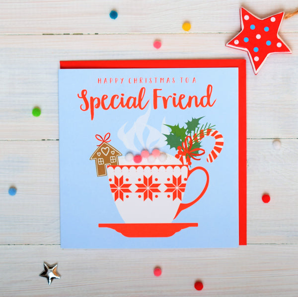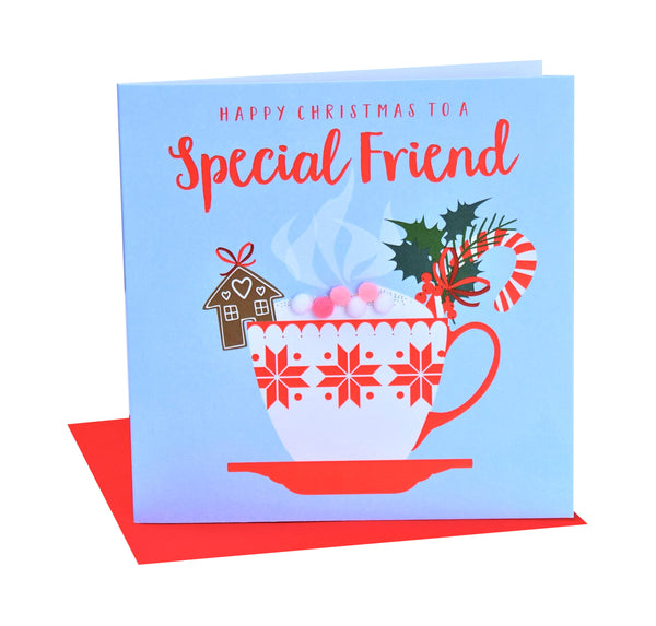 XP145A beautiful modern Christmas card. Give warm winter wishes to that Special Friend, with this marshmallow, candy cane and ginger bread house brew. Embellished with bright coloured pompoms and printed on high quality white board with a poppy red envelope.